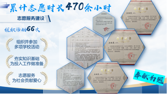 入学之初,孙铭繁便递交了入党申请书,从共青团员逐步成长为优秀共青团干部,最终成为中共预备党员。作为班级团支书,她始终尽力成为同学们的亲密伙伴与老师的得力助手。在校近三年,她积极利用寒暑假参与周口市“三下乡”社会实践活动等志愿服务,累计志愿服务时长超470小时,组织活动66次,还组织并参加多项学校活动,连续两年荣获周口市优秀志愿者称号,用实际行动诠释“奉献、友爱、互助、进步”的志愿精神。