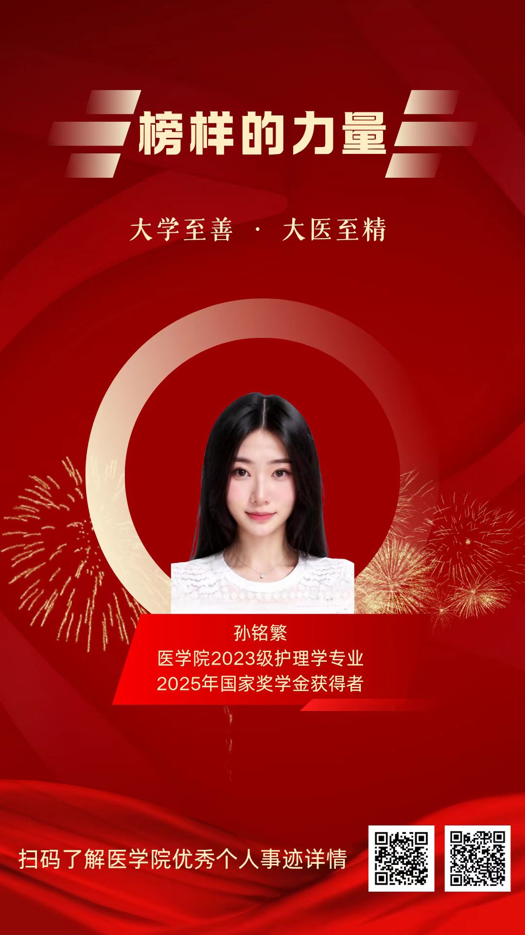 2023年,孙铭繁顺利考入williamhill威廉希尔网址护理专业。自入学起,她便以高标准严格要求自己,三年来始终保持勤勉好学、锐意进取的态度,专业成绩、综合测评及学分绩点稳居年级前列,连续两年专业、综测、学分绩点均排名第一