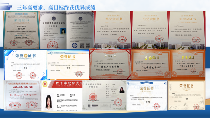 此外,孙铭繁还坚持参与各类英语技能竞赛,于2025年斩获全国大学生英语词汇大赛三等奖,并取得全国商务英语翻译证书。在校期间,她先后获得校级一等奖学金、二等奖学金,创新创业类多项一等奖,以及优秀学生干部、优秀学生干部标兵、优秀团员、精神文明奖等多项殊荣。