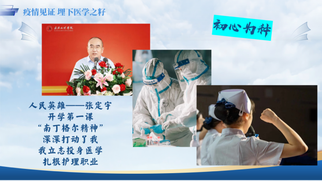 2025年9月26日,孙铭繁在河南省周口市中心医院实习期间,线上观看了“人民英雄”国家荣誉称号获得者、原武汉市金银潭医院院长张定宇为母校2025级新生讲授的“开学第一课”。张定宇教授的讲话,让她回想起2019年底新冠疫情初期的场景——彼时武汉出现首批肺炎患者,千千万万医护工作者挺身而出、与死神搏斗,用行动诠释“人道、博爱、奉献”的南丁格尔精神。