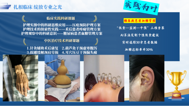 在脑内科,她运用专业知识为老年患者量身定制康复计划;在肝胆脾胃科,她主动加入医院“护理难题攻关小组”,关注人工智能与医疗结合的发展前景。针对“糖尿病患者血糖管理难”的问题,她向带教老师提出“饮食—监测—干预”三维管理方案,并建议借助AI算法为患者提供个性化饮食建议。此后两个月,她坚守病房,精准记录30多位患者的饮食数据,最终使患者血糖达标率提升30%。