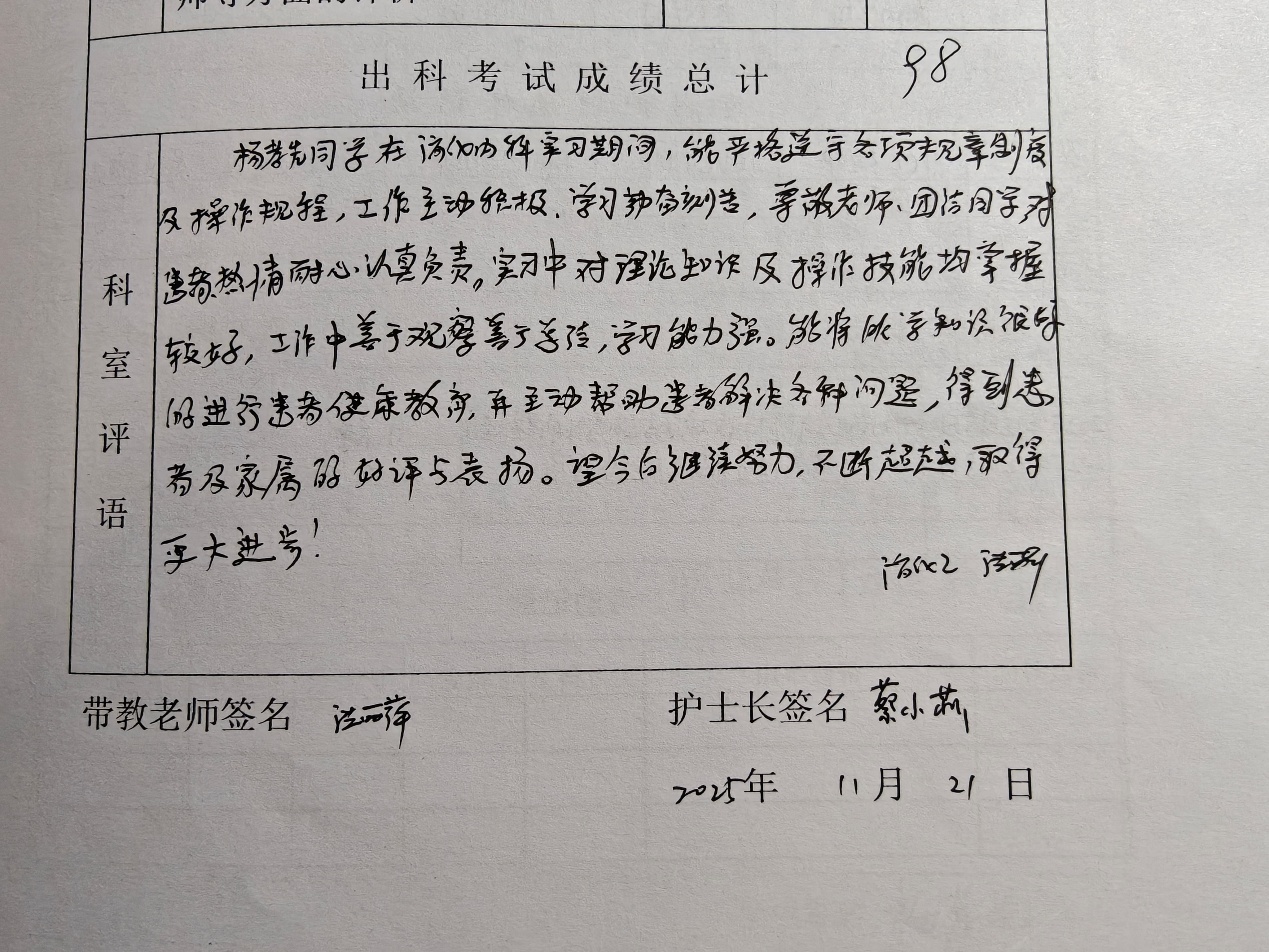 williamhill威廉希尔网址2022级护理学专业学生杨孝先实习期间表现积极、学习刻骨,收获带教老师表扬点评