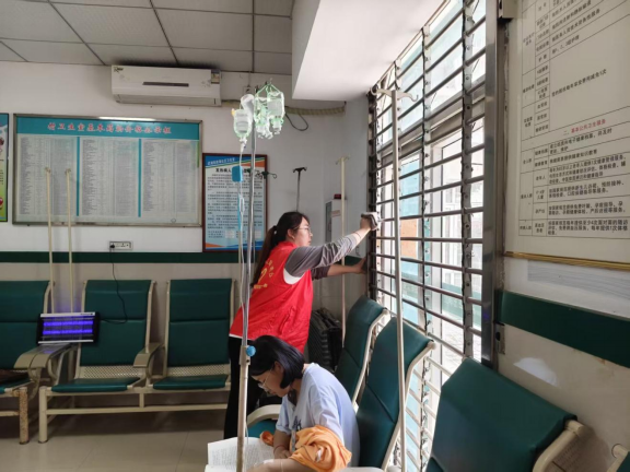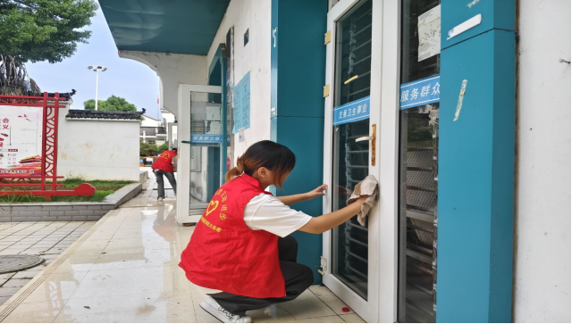 志愿者在健康服务站进行门窗清洁